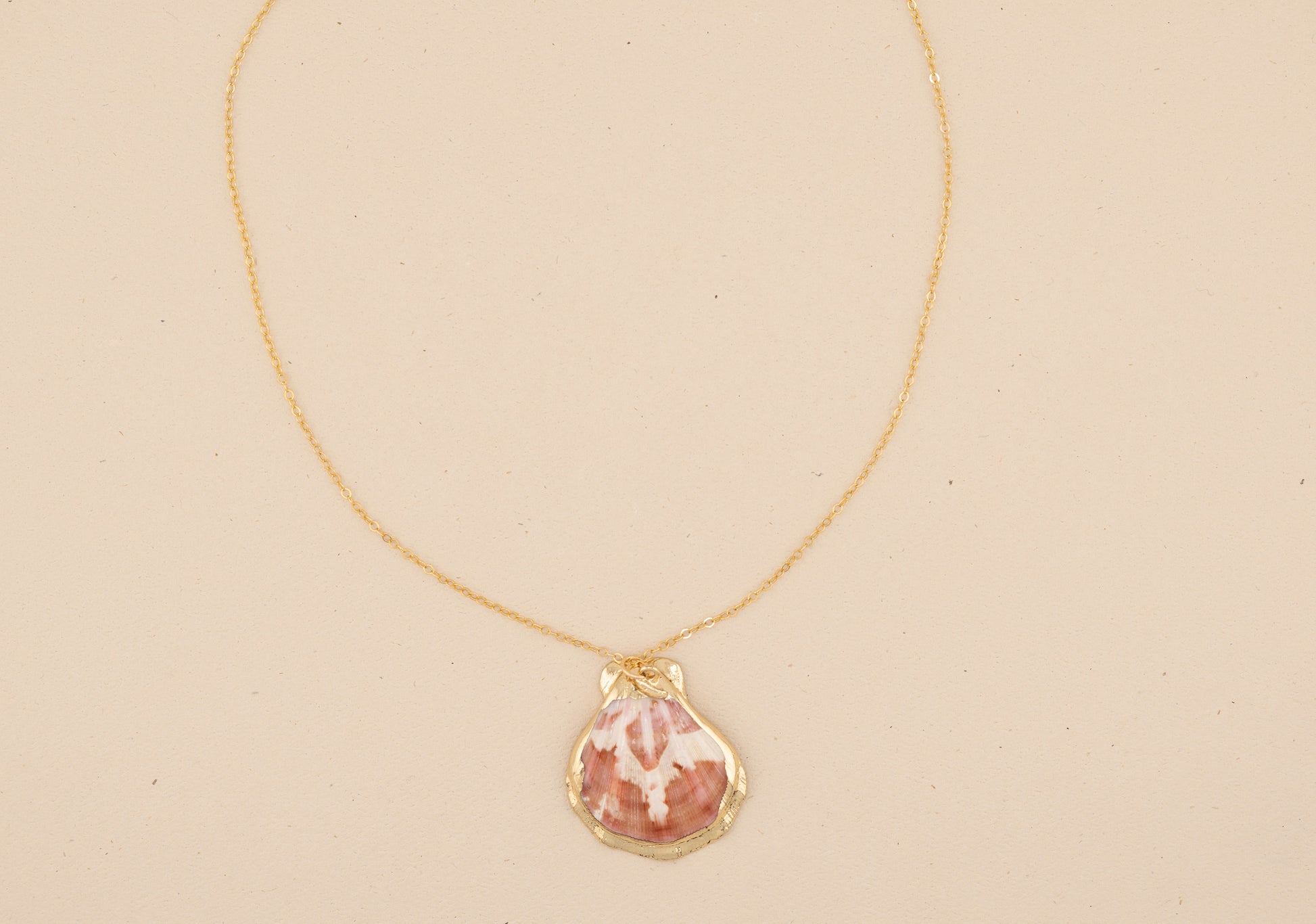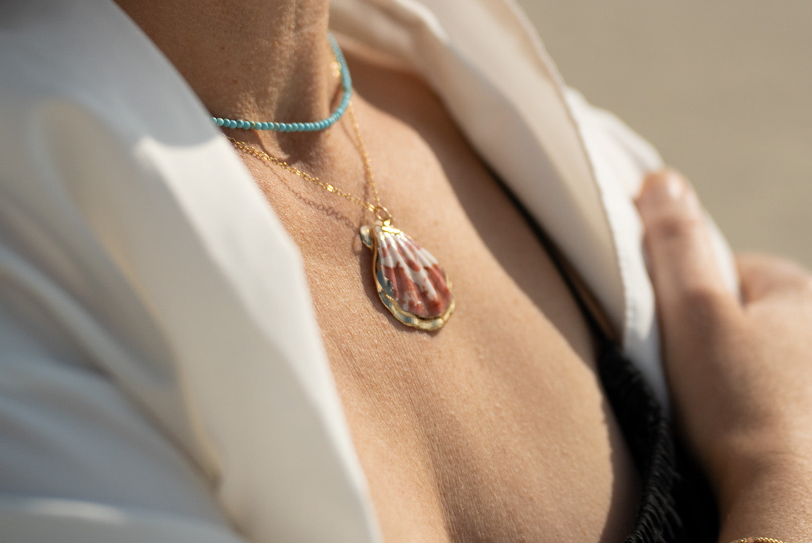 This genuine gold-trimmed shell is inspired by summertime at the beach.